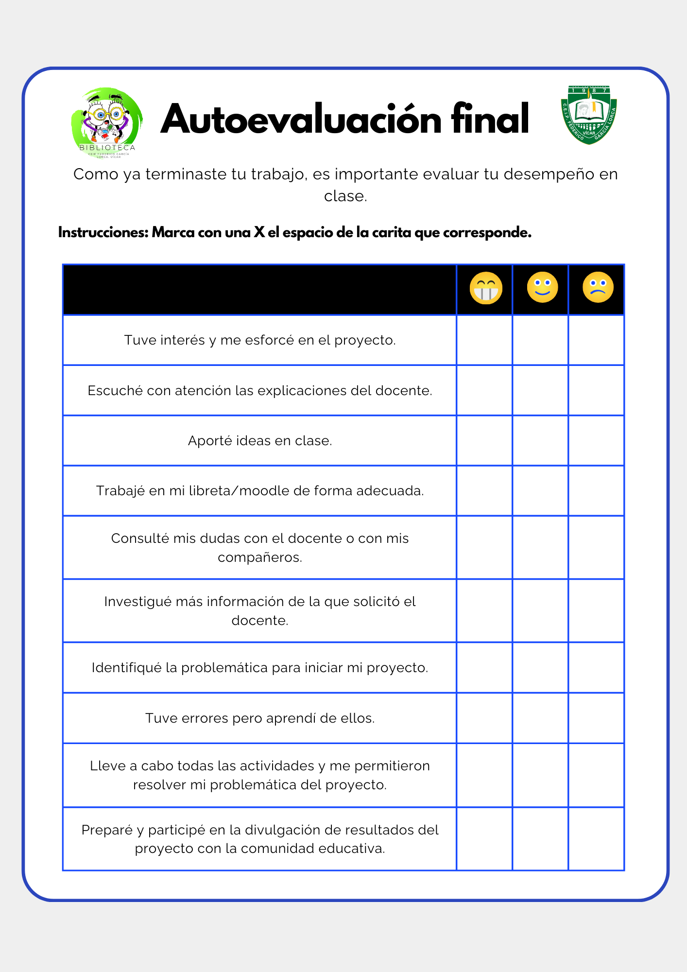 Para la evaluación de los proyectos y de las actividades se llevarán a cabo diversos instrumentos de evaluación y de autoevaluación al alumnado, profesorado, responsable, proyecto...