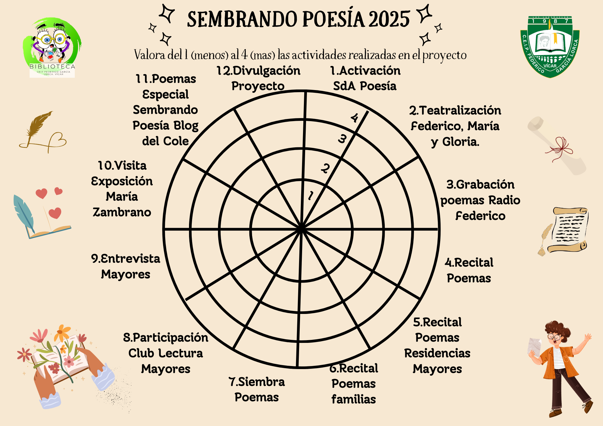 F) Continuar el trabajo en nuestra Radio y nuestra revista escolar. G) Continuar con la dinamización de diversas actividades para fomentar la lectura y como consecuencia, la mejora de la competencias lingüísticas en el centro, tales como encuentro con autores, taller de cómics, visita biblioteca local, trueque literario, encuentros inter centros día del libro, "Sembrando poesía", "Historias del Federico"... |