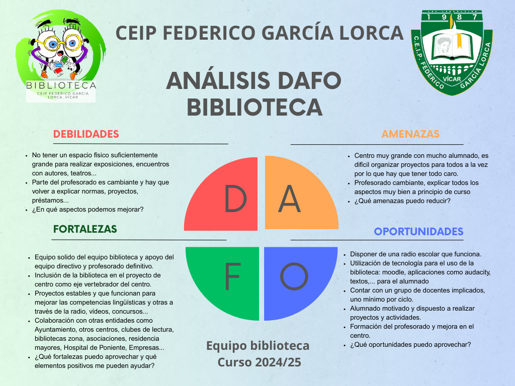 Basándonos en el Anexo I del DR2 sobre la organización y funcionamiento de la biblioteca escolar, en DAFO y la evaluación inicial realizada, situamos a nuestra biblioteca en situación C. Es decir, tiene un itinerario lector definido con un plan lector, y además, cuenta con un espacio web propio. La biblioteca además de ofrecer un servicio, plantea diversos proyectos, actividades y recursos e interviene en la elaboración de material y de actividades con otros programas.
