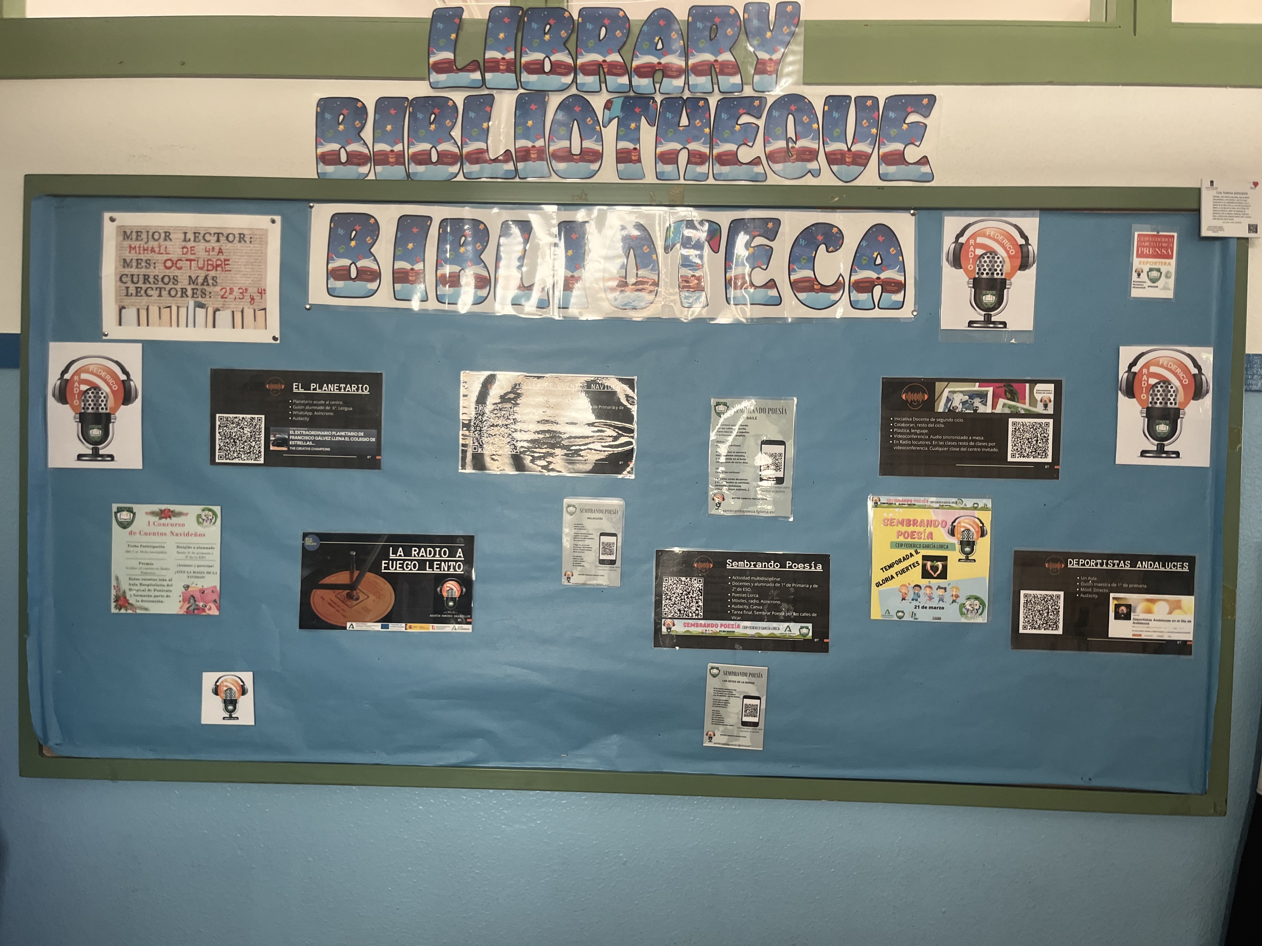 En cada espacio destinado para biblioteca se colocará un tablón de anuncios, dónde se informará de todas las actividades relacionadas con la lectura que se desarrollan en el centro y fuera de él, incluyendo las actividades que organizan las Bibliotecas Municipales de la zona.